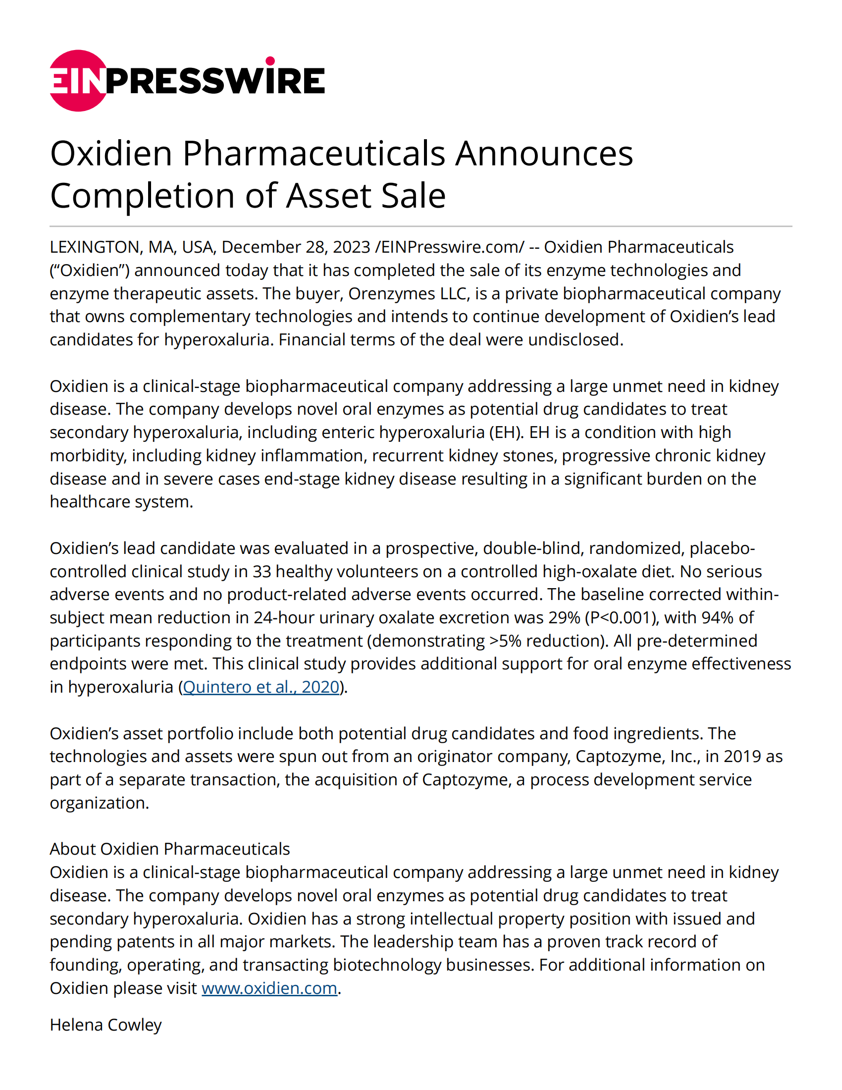 EINPresswire-677397680-oxidien-pharmaceuticals-announces-completion-of-asset-sale-2